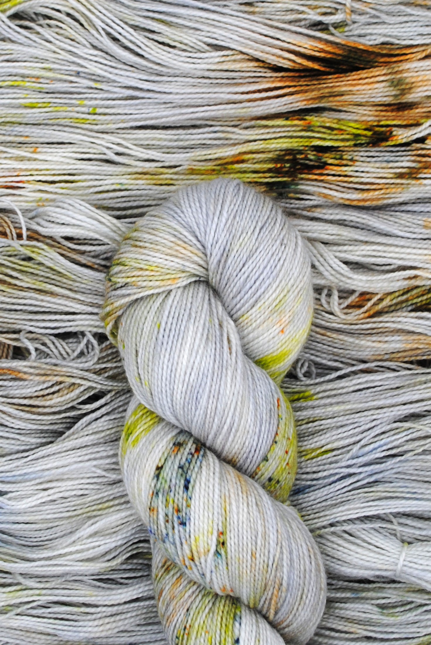 Who knew stains on concrete could make for glamorous colorway inspiration? Inspired by the vibe of Bob's Garage, this yarn features splashes of lime greens, rusty oranges and dark blues against a silvery backdrop.